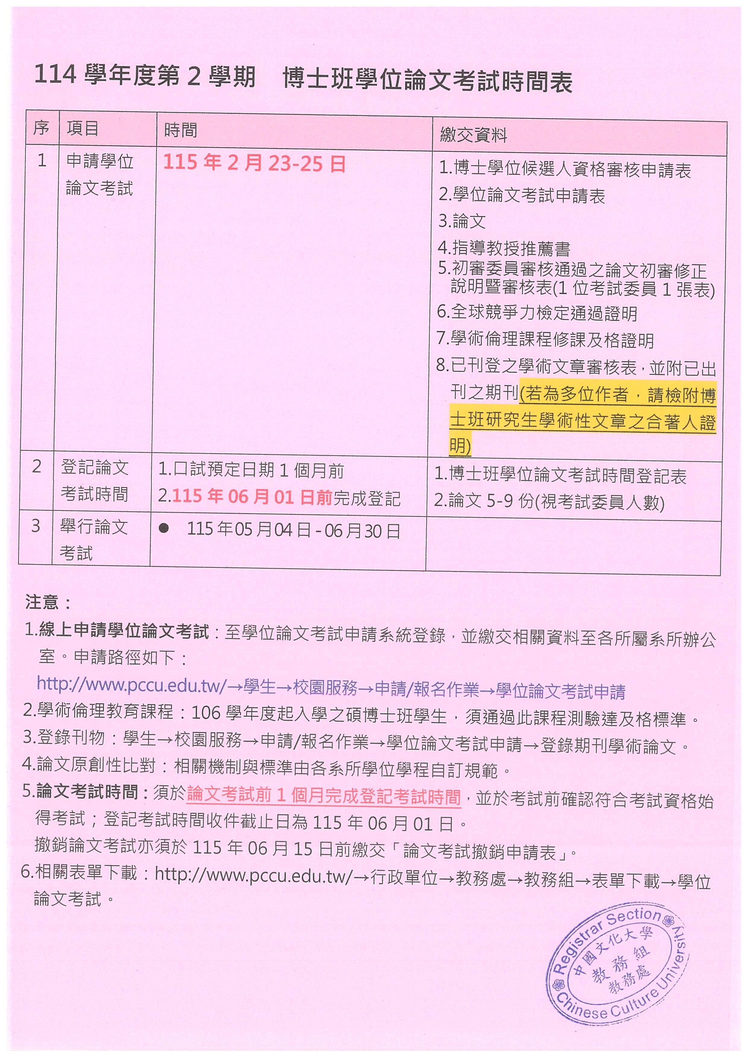 【學校公告】114學年度第2學期博士班學位論文考試相關時間及繳交資料